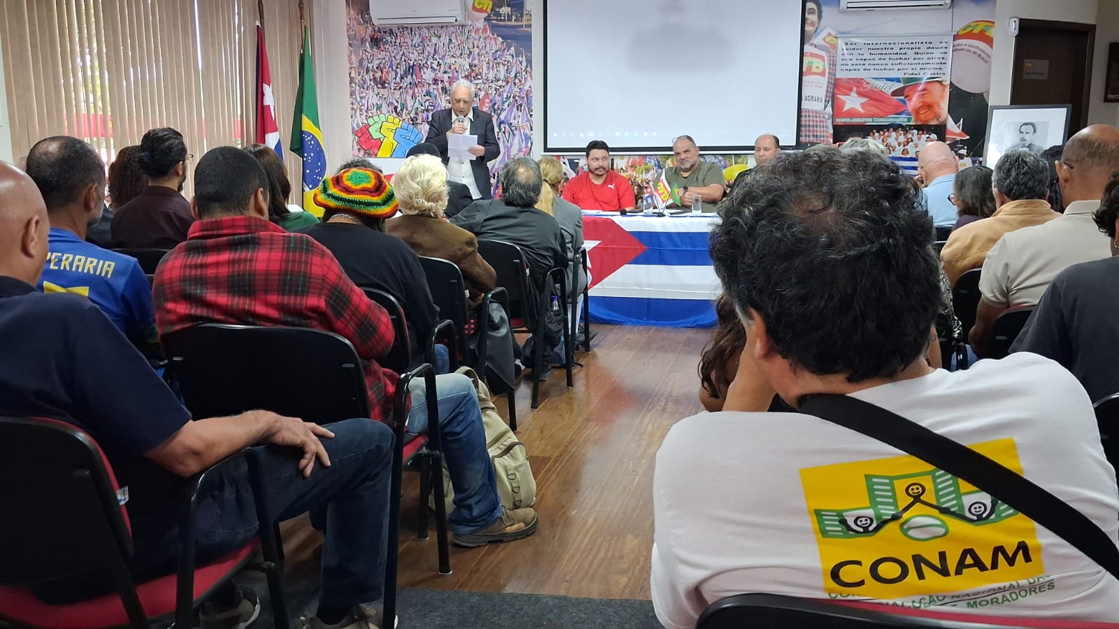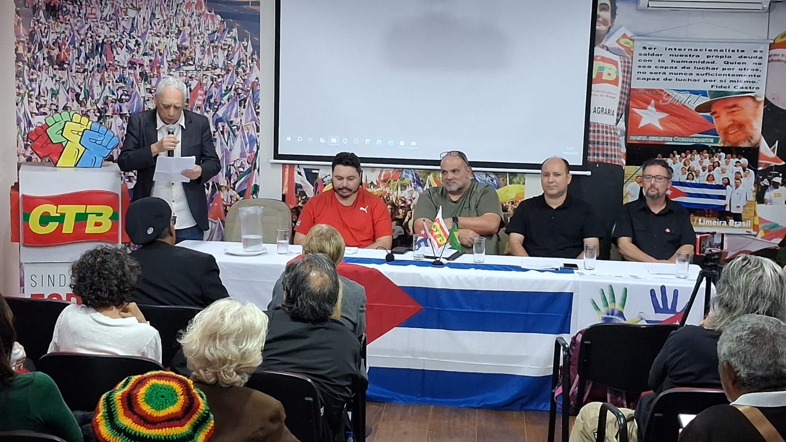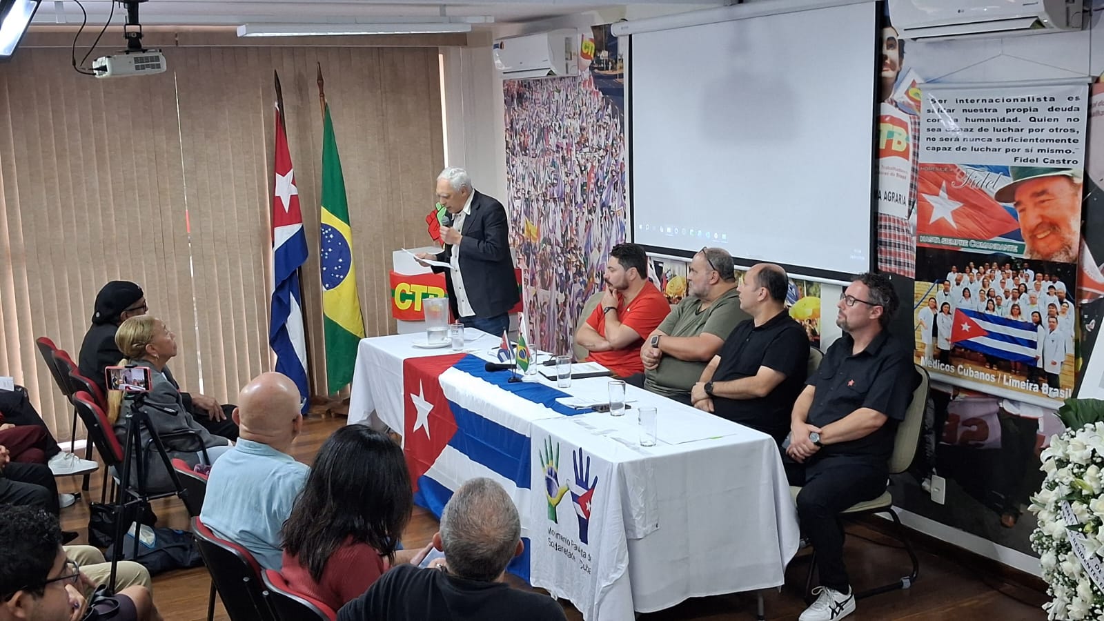 A Central dos Trabalhadores e Trabalhadoras do Brasil (CTB), em união com um vasto leque de entidades dos movimentos sociais, organizou neste 24 de janeiro um ato vigoroso de apoio e solidariedade à Revolução Cubana e ao povo venezuelano. Estiveram presentes Freitas e Tonhão pela FACESP – Federação das Associações Comunitárias do Estado de SP, representando a força organizada das comunidades; o Movimento Nacional Saúde Pela Democracia, guardião do direito à saúde e a CONAM – Confederação Nacional das Associações de Moradores, voz histórica da luta por reforma urbana e políticas públicas. Juntas, estas forças populares constroem um cenário de resistência e solidariedade, que nesta data carrega um significado especial: a celebração do aniversário do eterno revolucionário e poeta cubano, José Martí, cujo legado de amor à pátria e à liberdade ilumina nossa luta contra o imperialismo.